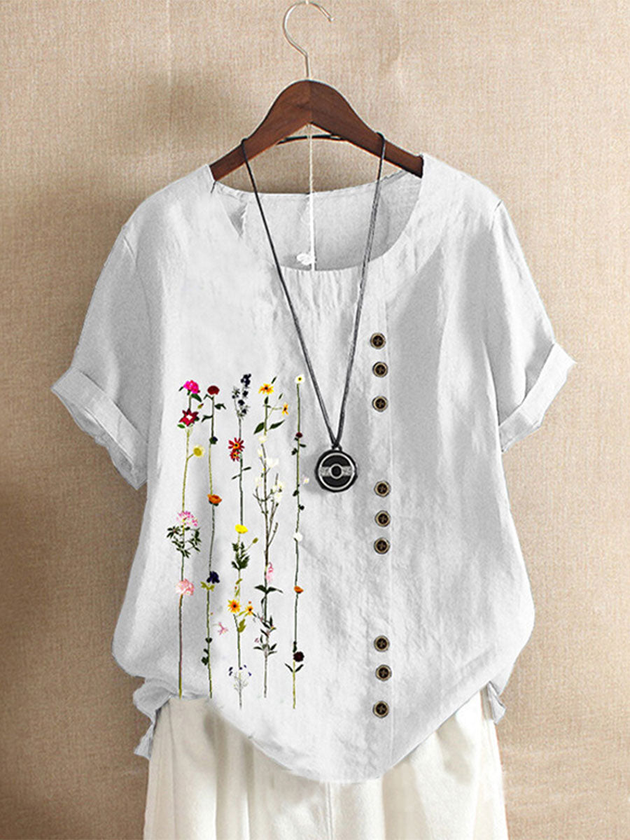 Casual loose cotton and linen printed short-sleeved T-shirt