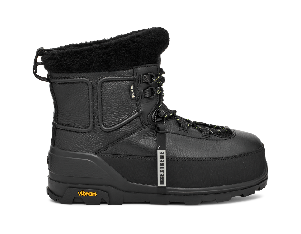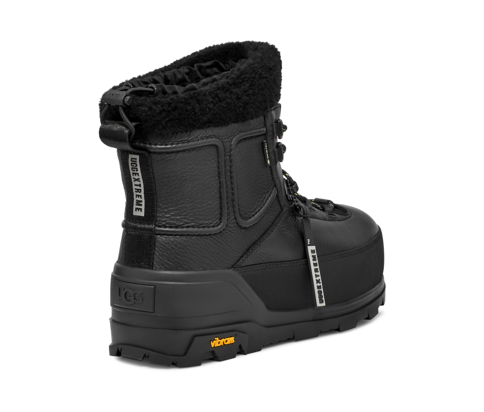 - utthhgg® logo on tongue, utthhgg® logo on heel, utthhggextreme™ screen printed logo on heel pull, GORE-TEX woven label, Vibram® Logo on outsole sidewall