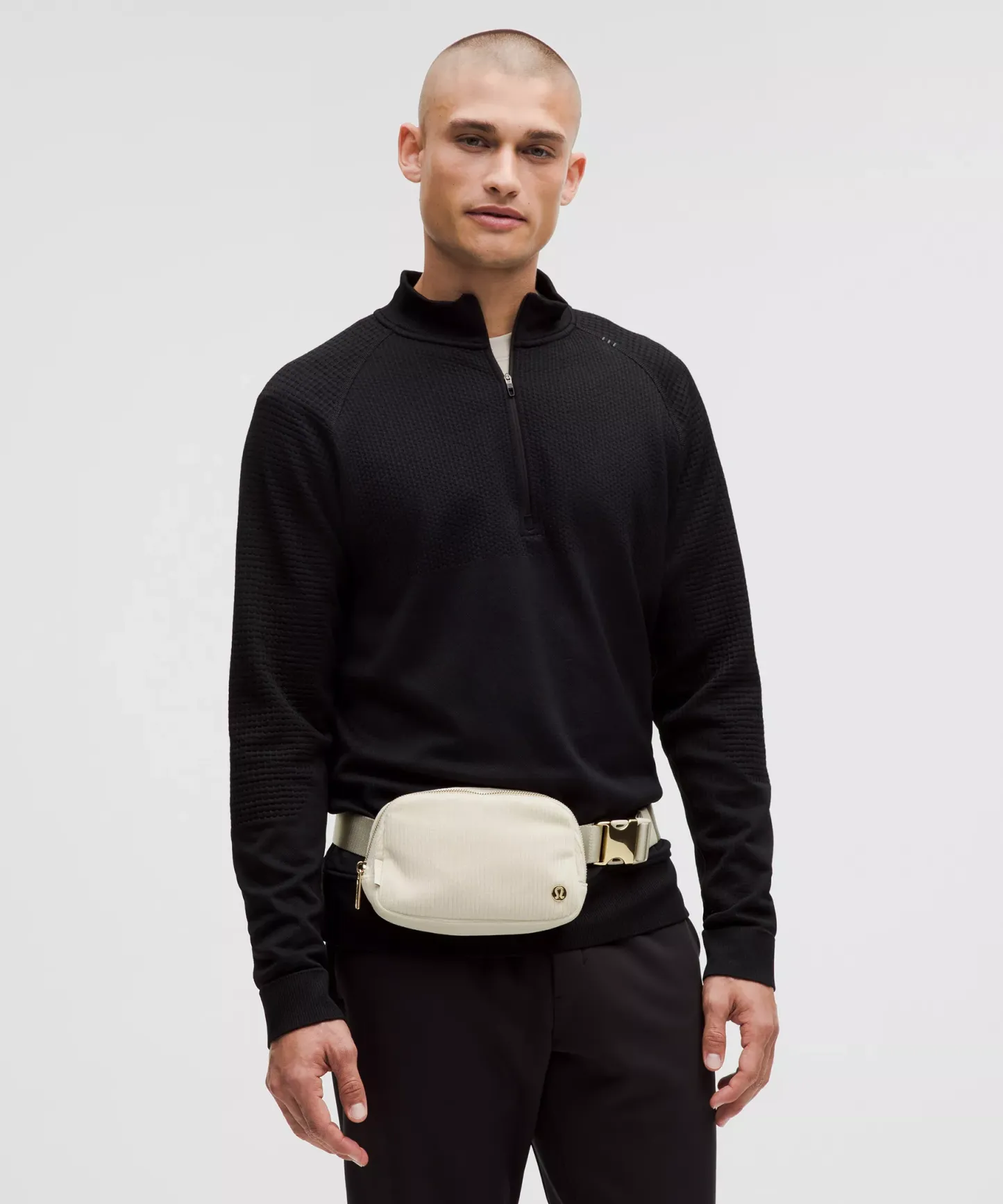 - Once you find your perfect fit, tuck the excess belt bag strap into the elastic loops