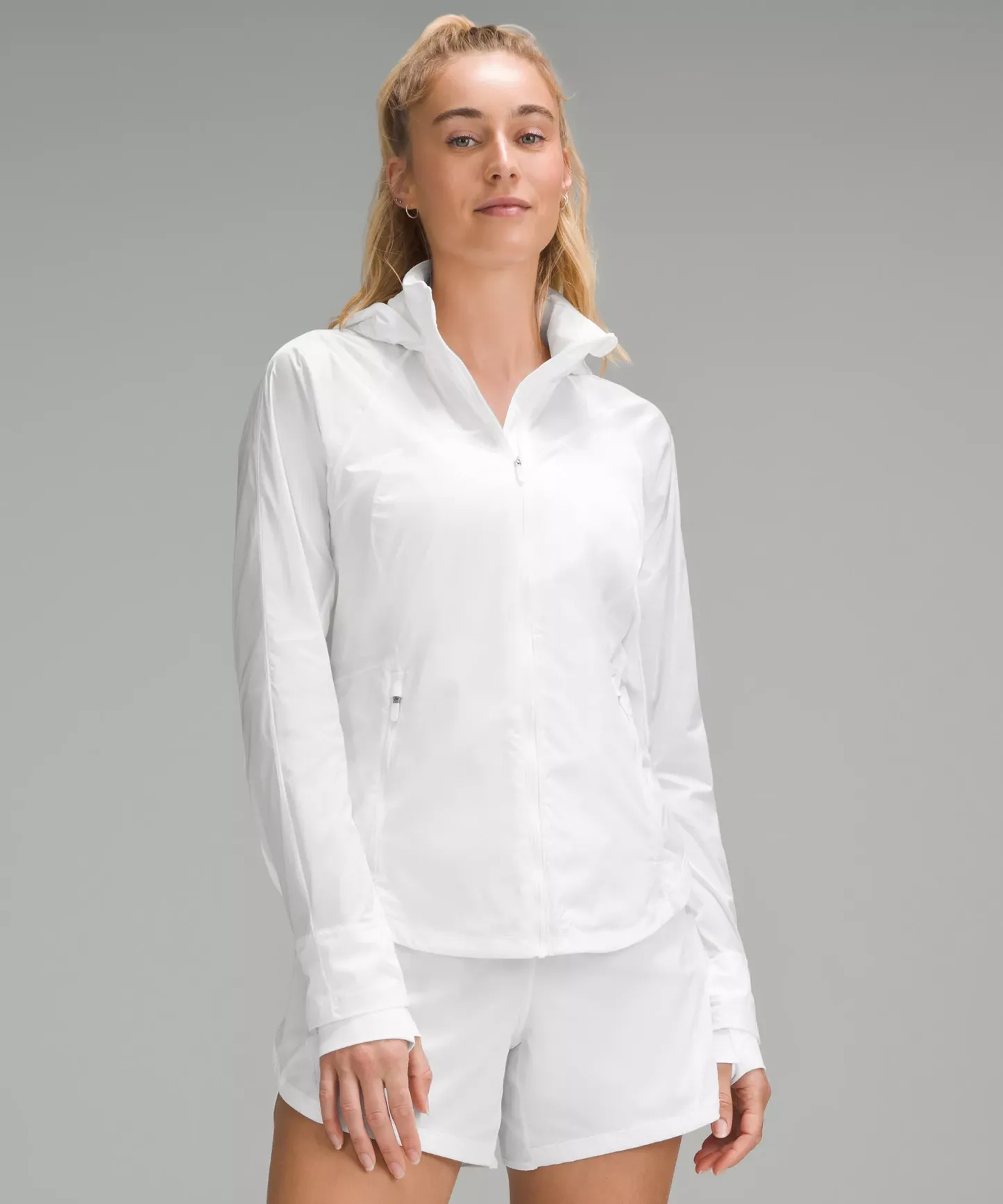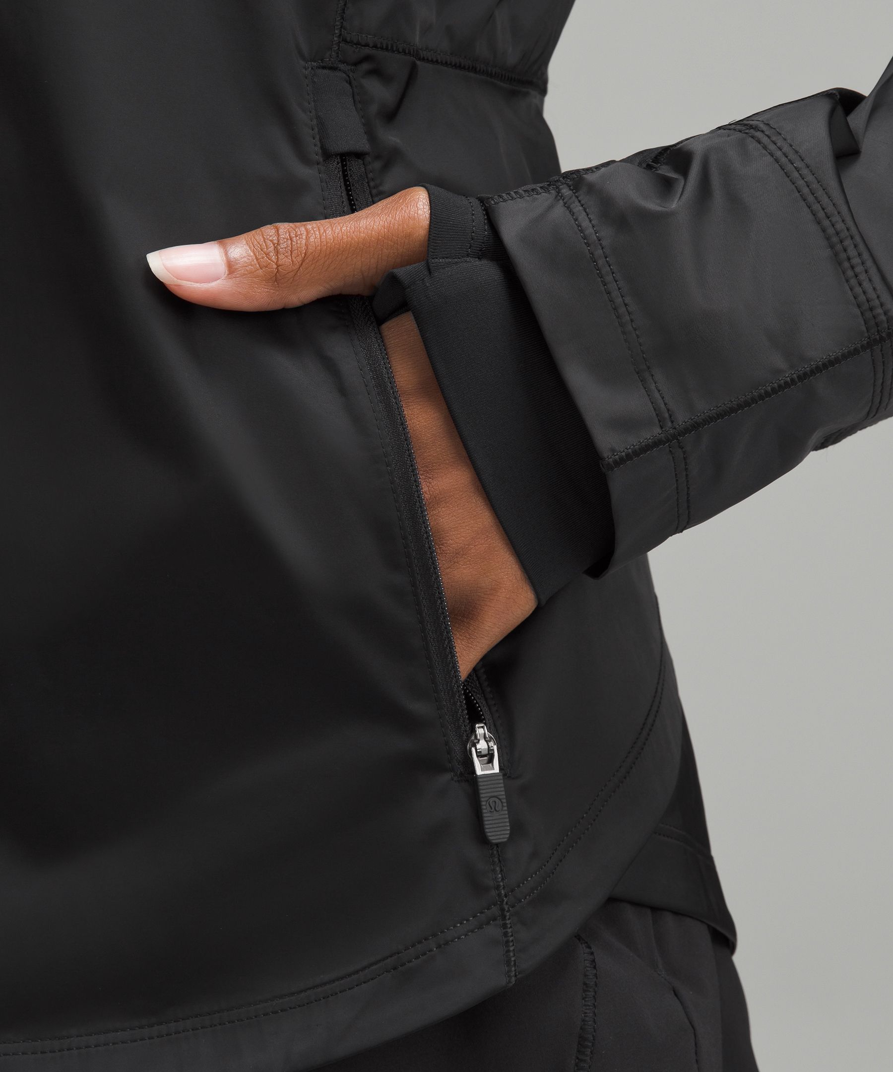- Zippered hand pockets with hidden phone sleeve