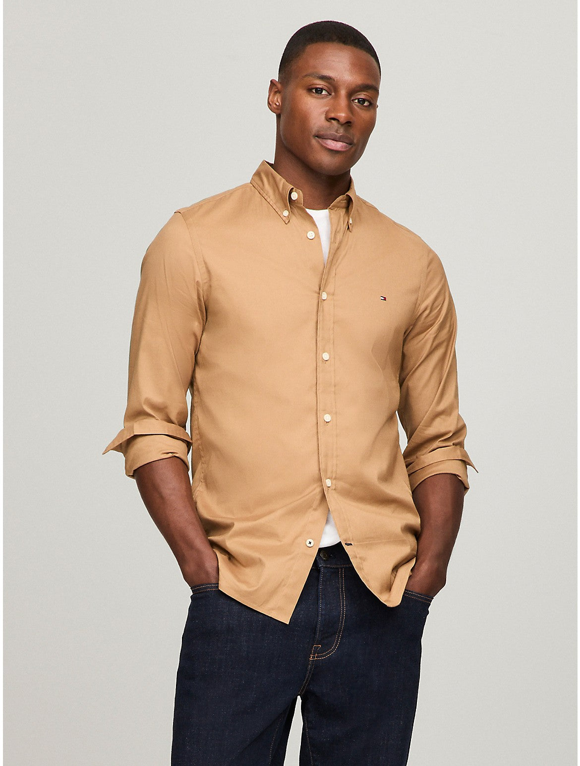 Tommy Hilfiger men's dress shirt. Our cotton poplin shirt has the crisp texture you expect, softened with an enzyme wash for a subtly smoother feel and looser drape. This version with added THFlex stretch pairs well with chinos, jeans, and even shorts鈥攎aking it an easy go-to for the office and beyond. Material - 97% Better Cotton Initiative, 3% Elastane.
