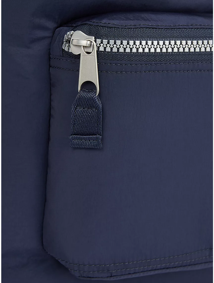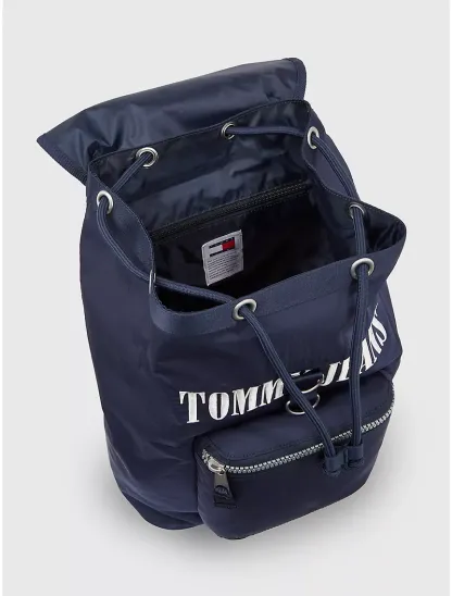 - Flap closure and drawstring closure, top carry handle, external zip pocket, internal zip pocket, padded adjustable shoulder straps.