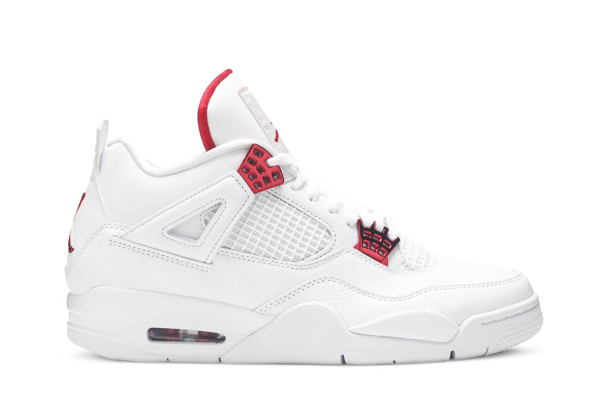 Launching as part of a four-piece Metallic Pack, the Air Jordan 4 Retro 'Red Metallic' treats the classic silhouette to a simple two-tone color scheme. The upper is constructed from white leather, complete with standard details that include quarter-panel netting and a visible Air sole unit at the heel. Contrasting pops of University Red appear on the molded eyelets, interior tongue and Jumpman branding hits at the heel and woven tongue tag.